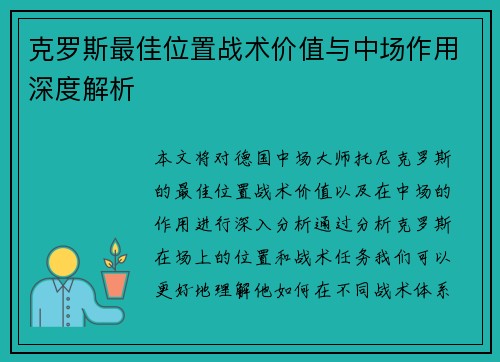 托尼·克罗斯(Toni Kroos)是当今足球界最具影响力的中场球员之一,他的技术特点不仅使他成为世界级球员,也使得他能够胜任多种不同的位置。在本篇文章中,我们将深入分析如何根据克罗斯的技术特点判断他适合踢的具体位置。通过分析他的传球能力、控球技巧、视野、以及防守能力等四个方面,我们可以更为准确地判...